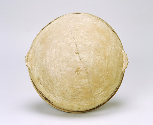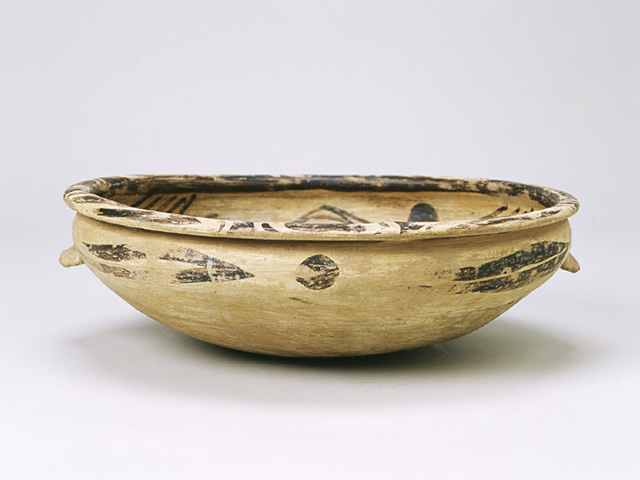 中国新石器時代の仰韶文化や馬家窯文化では特徴的な文様が描かれた土器(彩陶)が発達しました。黒色で美しい幾何学文様が施されたこの鉢は、馬家窯文化期のものと思われます。内面、縁の付いた口縁部、外面上部に文様が施され、両側に二つの把手が付いています。