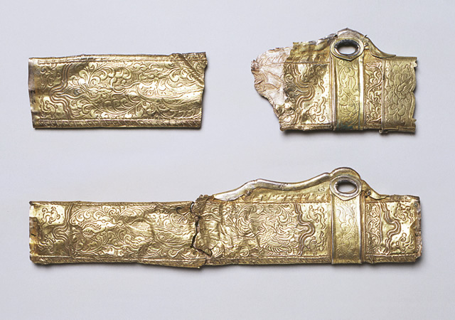 遼代の墓からは、鍍金された銀製品の出土が知られています。この鍍金銀製の鞘は、片面には龍が、もう片面には鳳凰が打ち出され、雲文、唐草文などが施されています。下は鞘口の飾りが失われており、鞘口の飾り金具の下にも文様が打ち出されていることが判ります。2点ともほぼ同形であったと思われます。