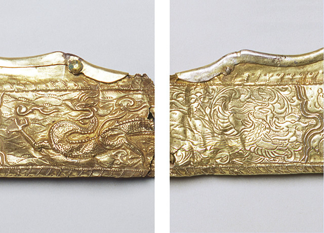 From Liao-dynasty tombs, gilded-silver objects have been excavated. These fragments of a gilded-silver sheath of a dagger can be reconstructed into two pieces, both of which bear a hammered out dragon motif on one side, and a phoenix on the other side.