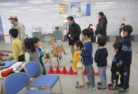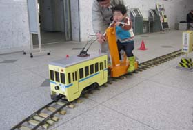 同じ建物内の横浜都市発展記念館で開催中の特別展「横浜にチンチン電車が走った時代」にちなみ、市電仕様の手回しトロッコを走らせました。右は順番を待つこどもたち。実は大人にも大人気でした。