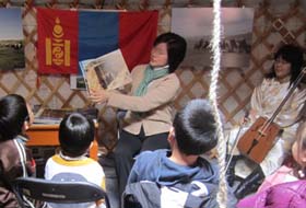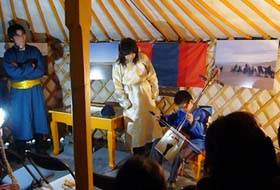 ゲルで行われた絵本の読み聞かせ。『スーホの白い馬』は馬頭琴とのコラボレーションでお楽しみいただきました。