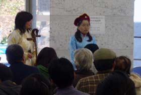 災いを払い幸いをよぶという馬頭琴の調べに震災の被災地への思いを込めました。お客様が入りきらず、ゲルから隣りの情報文化センター情文プラザに会場を移した二日目は、モンゴル人女性のデルゲルさんが、飛び入りで「母を思う歌」を歌ってくださいました。