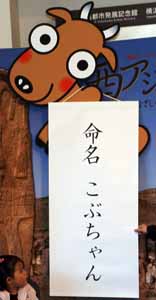 このこぶ牛の名前を公募、281通ものご応募をいただき、その中から6つの候補を選んで、ご来館のお客様やインターネットを通じてご投票をいただいた結果、最多票を得た「こぶちゃん」に決定いたしました。