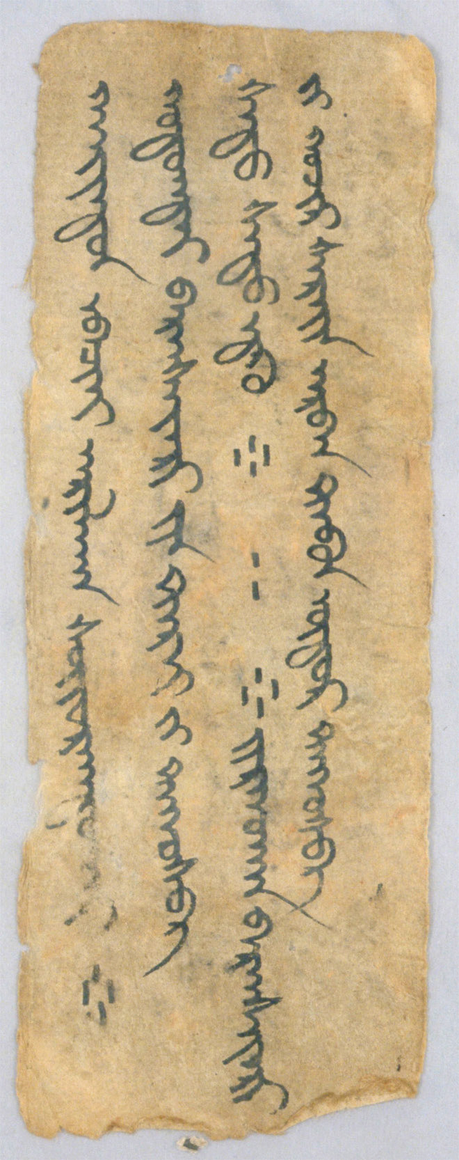 (1)qaniyatun ebečini arilγan sö(!)yurqatuγai (2) qutuγtai barnasavari-yin tarni (3) sadu sadu edgü. jirγuγan barnasavari (4) -yi qujir sarayin arban tabun edür daγusba